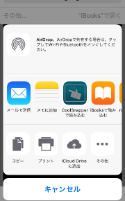用意したPDFファイルをiOS端末で表示し、「その他...→Cool Snapperで読み込む」を選択します。 以下の図は、Safari上で表示したPDFファイルをMMS(仮)で読み込むための操作です。(表示するアプリによって、「Cool Snapperで読み込む」を選択するための手順は異なります)