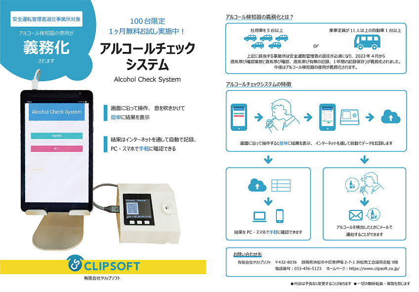システムに関する取材、お問い合わせ、導入をご検討の場合は お電話(053-456-5123)またはお問い合わせフォームをご利用ください。 まずは1ヶ月無料お試しから!(100台限定)