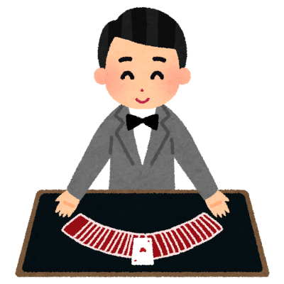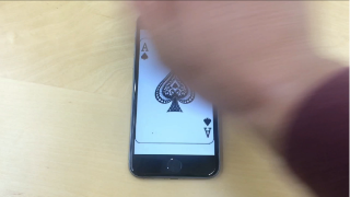 「選んだカードはスマホが当ててくれます」と言いながら黒い画面のスマホを見せ、
